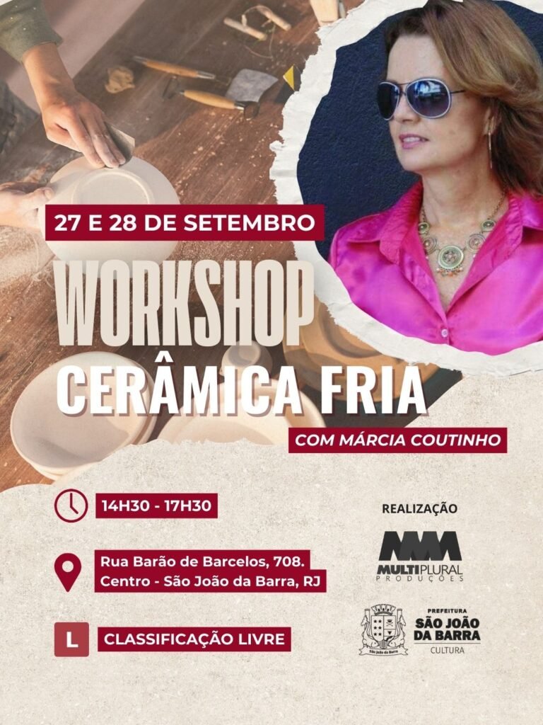 Nos dias 27 e 28 de setembro de 2025, a Casa Multiplural de Cultura (Rua Barão de Barcelos, 708), em São João da Barra/RJ, recebe o workshop “Cerâmica Fria – Pequenos Objetos”, com duração total de 6 horas, das 14h30 às 17h30. Ao final, os participantes receberão certificado de participação.